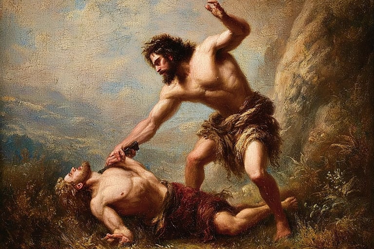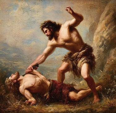 Adam et Eve avaient manqué au premier des commandements de Dieu à l’homme, commandement sous-entendu dans cet autre — d’obéissance — qui leur fut donné à tous deux: "De l’arbre de la connaissance du bien et du mal tu ne mangeras pas". L’obéissance est amour. S’ils avaient obéi sans céder à aucune pression du Mal sur leur âme, leur intelligence, leur corps et leur chair, ils auraient aimé Dieu "de tout leur coeur, de toute leur âme et de toutes leurs forces", comme cela leur fut explicitement ordonné bien plus tard par le Seigneur. Ils ne l’ont pas fait et furent punis. Mais ils n’ont pas péché contre l’autre versant de l’amour, c’est-à-dire à l’égard de leur prochain. Ils ne maudirent même pas Caïn, mais ils pleurèrent en égale mesure sur celui qui était mort dans la chair et celui qui était mort spirituellement : ils reconnaissaient en effet que la souffrance permise par Dieu était juste, parce qu’ils avaient eux-mêmes créé la souffrance par leurs péchés et devaient être les premiers à en faire l’expérience sous toutes ses formes. Ils sont donc demeurés enfants de Dieu, et avec eux leurs descendants venus après cette souffrance. En revanche Caïn pécha à la fois contre l’amour de Dieu et contre l’amour du prochain. Ayant radicalement violé l’amour, Dieu l’a maudit mais Caïn ne s’est pas repenti. Il s’ensuit que lui-même et ses enfants ne furent que les fils de l’animal qualifié du nom d’homme.